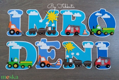 Kék járműves munkagépes dekorgumi név 12cm falmatrica babanév , NÉVNAP