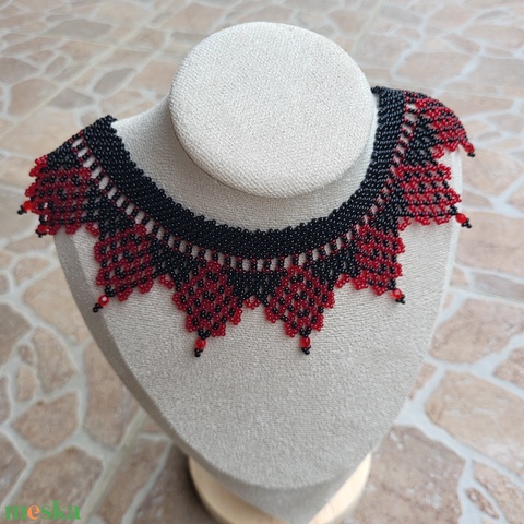 Ukrán, szívecskés gyöngygallér - piros,fekete
