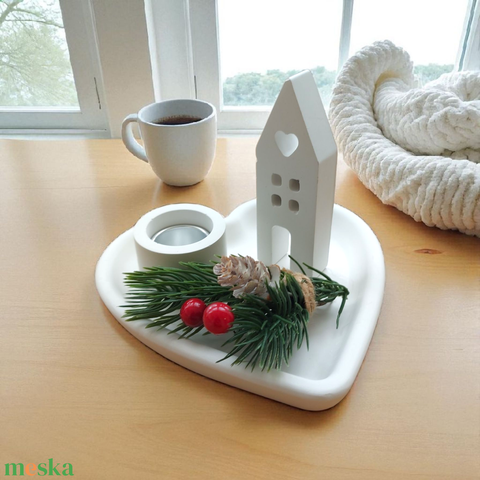 Karácsonyi Szív gyertyatartó házikóval, gyertyával