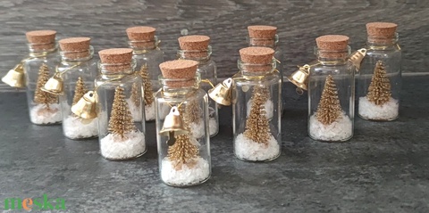 üvegcse, műfenyő, műhó, csengettyű, akasztó