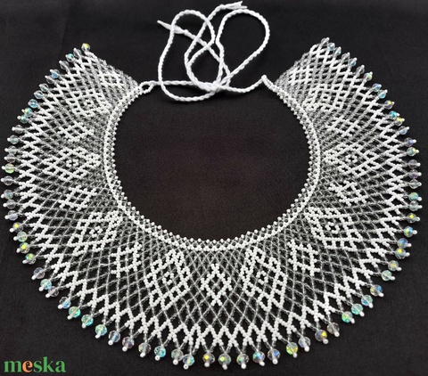 Széles átlátszó-fehér ukrán gyöngy nyaklánc, gyöngygallér, gyöngyékszer, Meska