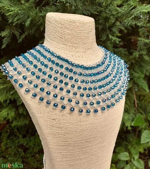 Széles türkiz-ezüst gyöngy nyaklánc, gyöngygallér, gyöngyékszer, Meska