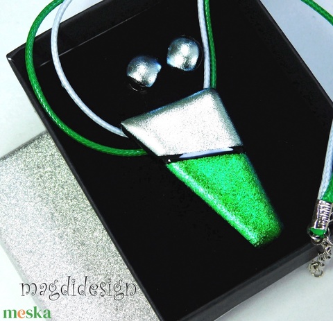 Ezüst zöld csillogás üvegékszer szett nyaklánc stiftes fülbevaló