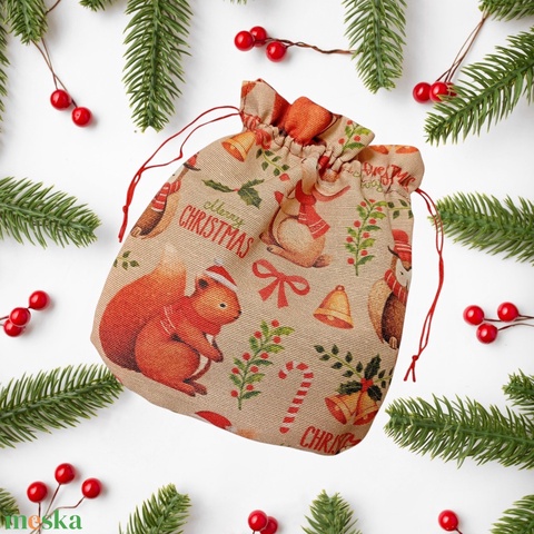 Karácsonyi mintás összehúzható zsákocska - Mókuskás