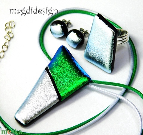 Ezüst zöld csillogás üvegékszer szett nyaklánc, gyűrű, stiftes fülbevaló