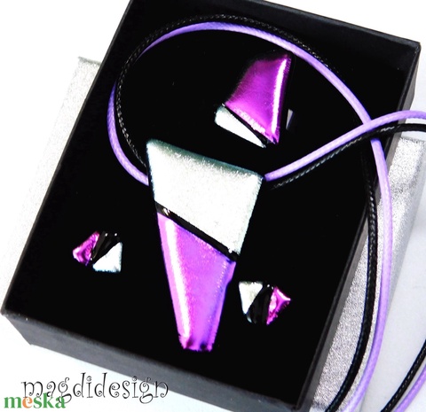 Ezüst ciklámen csillogás üvegékszer szett nyaklánc, gyűrű, stiftes fülbevaló