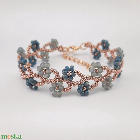 Gyöngyös virágos, színjátszós kék és szürke karkötő