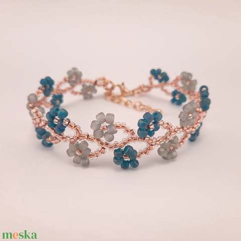 Gyöngyös virágos, matt kékeszöld és színjátszós szürke karkötő