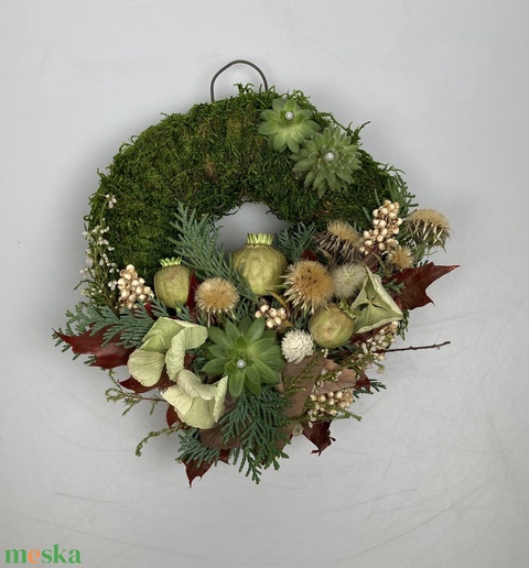 - Anyaga: kellékek, termés, szárazvirág, mohakoszorú