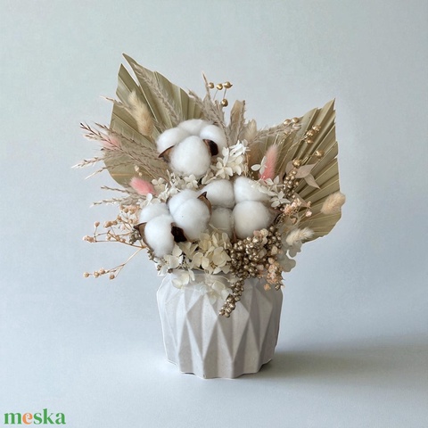 - Anyaga: szárazvirág, pampafű, pálma, pamut, kaspó