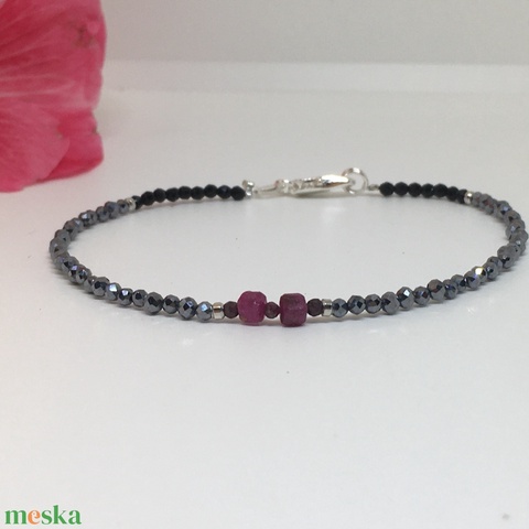 2mm-es fazettált terahertz, 3mm-es kocka, 2mm-es rubin és 2mm-es fekete spinell szemekből fűzött karkötő.