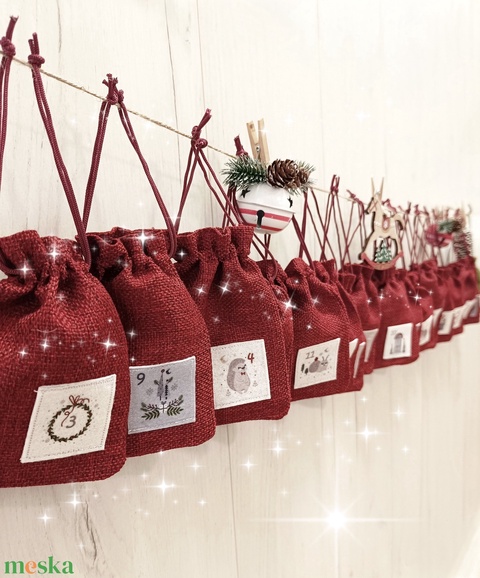 Filc rátéttel zsákokat készítettem bordó poliészter jutazsák utánzatú anyagból. (tartósabb és nem szöszöl, mint az eredeti juta anyag). 24 bájos számozott filc motivumot vartam rá, mind más gyönyörű kép az ünnepekről csigával és sünivel. Az utolsó zsákot zöld anyagból vartam, úgy éreztem az utolsó nap így nagyobb hangsúlyt kap. Natúr zsineget küldök hozzá, ezzel fel is tudjuk akasztani de dobozban, ablakpárkányon is jól mutat. 13,5 ×10 cm-es, több apróságot is rakhatunk bele. Amit tartalmaz a csomag: 24 zsák, 4 m zsineg ha felfűznénk. A dekorációk nem képezik az ajánlat részét. Tehetünk bele sok mindent, főleg gyerekeknek, álljon itt néhány ötlet az édességen kivül: pattogós labda, fa állatkák, zsírkréta, vicces radír, jojó, lego bábu, kártya, pörgettyű, illatos szájfény, pixel hobby kulcstartó készítő szett, kis autó, notesz, apától/anyától egy délutáni program, bábszínházi jegy, matricák, lufi, memori (akár minden nap egy újabb pár), karkötő, játék babaruha, minta lukasztó, hajgumi, iránytű, gumi (ugrálós játékhoz), gyurma....és még sok minden!