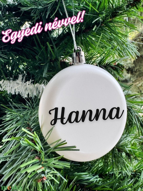 Egyedi neves karácsonyfadísz - fehér lapos gömb, egyedi karácsonyfadísz névvel, saját szöveggel