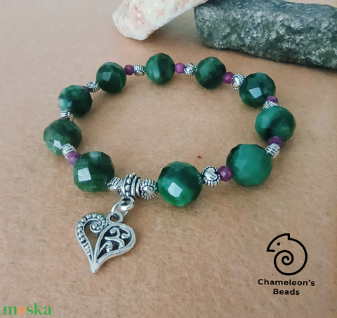 - Anyaga: zöld csillámpala fazettált gyöngy, rubin fazettált gyöngy, antik ezüst köztes, antik ezüst charme