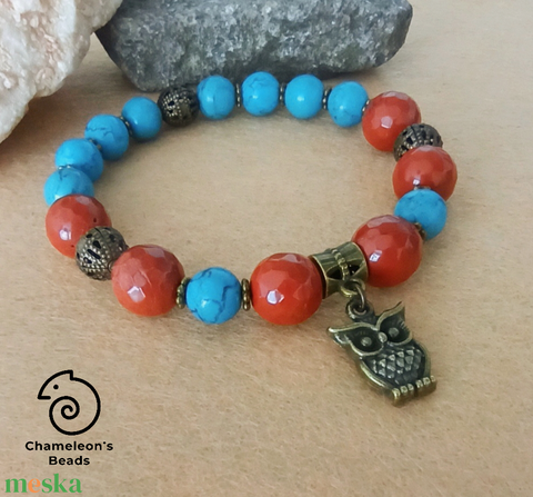 - Anyaga: vörös jáspis fazettált gyöngy, tibeti türkiz gyöngy, bronz színű köztes, bronz színű charme