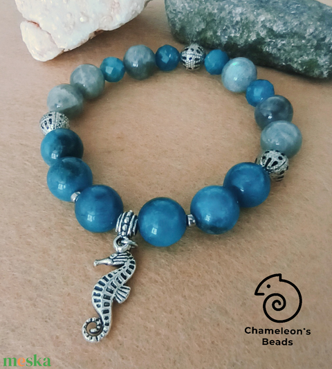- Anyaga: akvamarin gyöngy, labradorit gyöngy, ezüst színű köztes, ezüst színű charme
