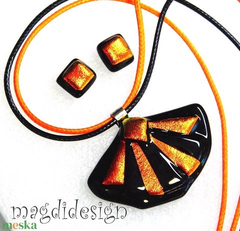 Fekete narancs legyező üvegékszer szett nyaklánc, stiftes fülbevaló