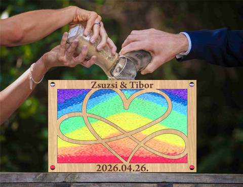 Ez a homokceremónia doboz szív és végtelen szimbólumokkal gravírozva kiváló választás azoknak, akik szeretnék az esküvőjük érzelmileg legfontosabb pillanatát megőrizni. A natúr fa és plexi kombináció elegáns, átlátszó plexi , és gravírozható felirattal készül (pl. nevek, dátum). Dekorációként is megállja a helyét otthonotokban, miközben emlékeztet arra a napra, amikor ketten eggyé váltatok. Ráadásul e kedves szertartás fantasztikus emléke otthonotok díszeként élhet tovább. A tároló anyaga: fa- natúr szinű és plexi 1 db fa doboz duplaszíves mintával 16x10 cm 2 db fa téglalap alkú kiöntő 250ml/db (választható) A homokot külön tudjátok megrendelni. Gravírozott homokceremónia doboz végtelen Gravírozott homokceremónia doboz végtelen és szív szimbólummal – örök emlék, amely nem csak az esküvő napján, de egész életetekben jelentős marad. A doboz natúr fa oldalakkal és plexi tetővel készült, hogy a homokceremónia során jól látható legyen, ahogy a homok összeolvad. A gravírozott végtelen jel és szív motívum szimbolizálja az örök szerelmet és az összetartozást. A homokceremónia doboz feliratozható — kérhető rá a pár neve, az esküvő dátuma, vagy akár egy rövid személyes üzenet, hogy még bensőségesebb legyen az emlék. Mérete ideális arra, hogy szertartási kellék legyen, de emellett díszként is szolgáljon otthonotokban, polcon vagy vitrinben. Anyaga: fa, plexi tetővelKivitelezés: gravírozott, részletgazdag végtelen és szív szimbólumFunkció: homokceremónia doboz + dekoráció + emlék Válaszd ezt, ha szeretnél valami igazán személyeset, amely csodálatosan mutat az esküvőn, és később új funkciót nyer: emlékként, otthon díszeként. Egyedi gravírozott felirattal és részletekkel ellátott, ez a készlet minden esküvői ceremóniát magával ragadóvá varázsol. A párok számára, akik szeretnék még különlegesebbé tenni az esküvőjük szertartását, ez a homokceremónia készlet tökéletes választás. Örök emléket teremtve az esküvő szépségéről és jelentőségéről, amely mindig emlékeztetni fogja őket az ifjú szerelmi történetük kezdeti pillanataira.