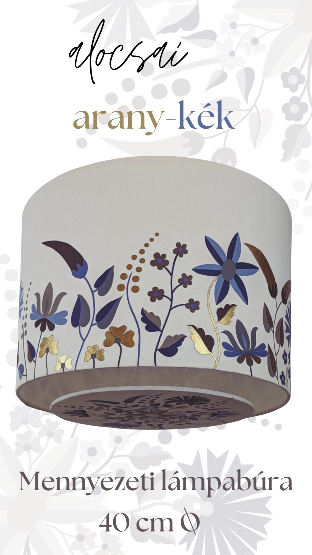Kalocsai mintás, arany–barna–kék színvilágú, egyedi tervezésű dob lámpabúra