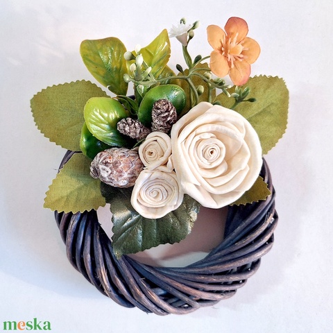 - Anyaga: műnövény, szárított termés, fonott vessző koszorúalap