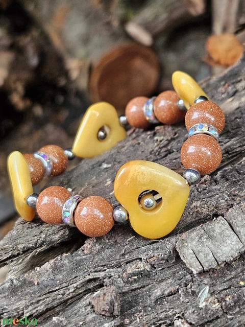 - Anyaga: gumis damil, hematit gyöngyök, homokkő gyöngyök, strasszos rondellák, szív ásvány köztesek