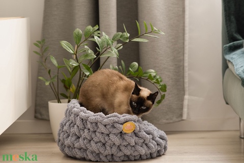 Cirmoskuckó kézműves cicakosár – a dorombolás otthona A Cirmoskuckó egy különleges hely a cicák és gazdáik életében – egy kézzel készült, otthonos menedék, amit kifejezetten a cicák természetes igényeire szabva alkottunk meg. Ez a kézműves cicakosár nem csupán egy praktikus alvóhely: valódi szeretettel és odaadással készült darab, amely megadja a négylábú családtagnak mindazt a kényelmet, amit megérdemel. Minden Cirmoskuckó egyedileg készül vastag zsenília fonalból, amely nemcsak esztétikus, de rendkívül puha tapintású és bolyhos fonal, így meleg, barátságos textúrájával tökéletes pihenőhelyet kínál a cicáknak. A vastag fonal lehetővé teszi, hogy a kosár falai stabilak és formatartók legyenek, ugyanakkor rugalmasan öleljék körbe kedvenced testét, fokozva az otthonosság érzését. A kosár mérete kb. 40 cm átmérőjű és 18 cm magas, így tökéletes választás lehet egy nagyobb testű cicának vagy akár két kisebb cicának is. A fonalat kézi horgolással dolgozzuk fel, így minden darab egy kicsit más – nincs két teljesen egyforma Cirmoskuckó, ahogy nincs két egyforma cica sem. Az eltérések nem hibák, hanem a kézimunka szépségei, melyek különleges karaktert kölcsönöznek minden egyes kosárnak. A Cirmoskuckó magyar kézműves termék, helyben készül, kis szériában, környezettudatos gondolkodással. Ideális ajándék lehet bármelyik cicatulajdonosnak, aki szereti az igényes, egyedi darabokat – vagy épp saját cicádnak, aki megérdemel egy meleg, puha, saját kis birodalmat. A kosár könnyen tisztán tartható, mosógépben mosható, strapabíró, és jól tűri a használatot. Használat után, egyetlen kézmozdulattal visszarázható eredeti formájára. A színvilága gazdag, így könnyen illeszthető bármilyen stílusú lakásba.