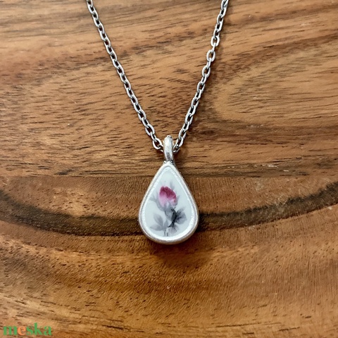Zsolnay mentett darabok - pici rózsabimbós porcelán nyaklánc - csepp medál nemesacél lánccal