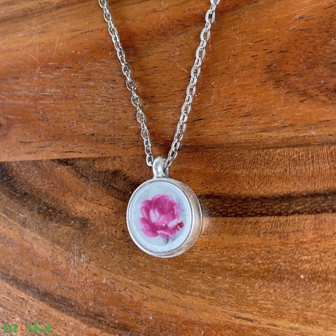 Zsolnay mentett darabok - rózsás porcelán nyaklánc - pici medál nemesacél lánccal