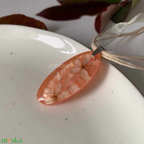 Kökényvirág medál barack árnyalatú háttérrel, kézzel készült gyantaékszer