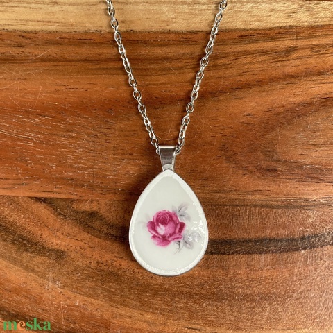 Zsolnay mentett darabok - rózsás porcelán nyaklánc - nemesacél csepp medálos nyaklánc