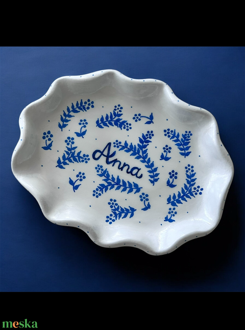 Fehér alapon aprólékosan festett kék virágminta díszíti, közepén pedig kézzel írt név kerül elhelyezésre – így minden tálka teljesen személyre szabott.