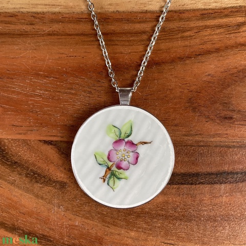 Herendi mentett darabok - nemesacél nyaklánc virágos porcelánnal, nagy medál