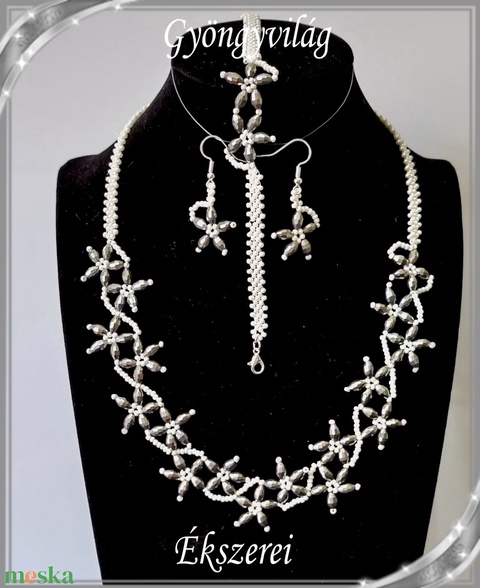 - Anyaga: gyöngy, ezüstözött kapocs, gyöngy