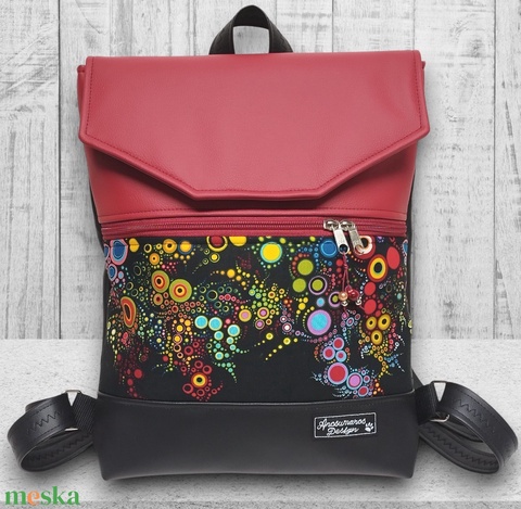 Egyedi darab! Buborékok - Bőrpántos fedélrészes pakolós Liza hátizsák 4 zsebbel 36x30x8cm fekete-bordó