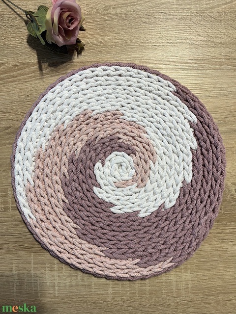 Horgolt asztalközép spirál mintával (fehér, babarózsaszín, antikrózsa)
