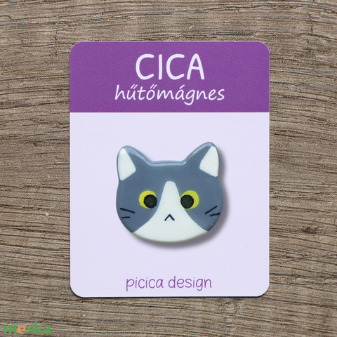 Cica hűtőmágnes - Szürke tuxedo Kancsal
