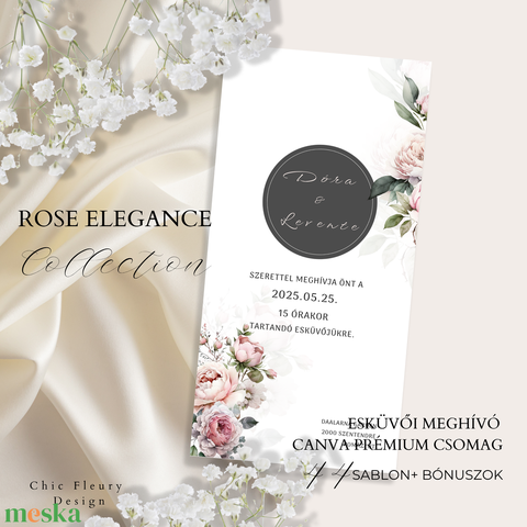 Az esküvőszervezés sokszor stresszes lehet, de meghívóid tervezésének nem kell annak lennie. Ezzel a csomaggal minden elem tökéletesen illeszkedik egymáshoz, így időt, energiát és utánajárást spórolsz meg. Akár meghitt kerti szertartást, akár nagyszabású vidéki lakodalmat tervezel, a Rose Elegance Kollekció természetes, szívhez szóló hangulatot kölcsönöz, amelyre a vendégeid mindig emlékezni fognak.