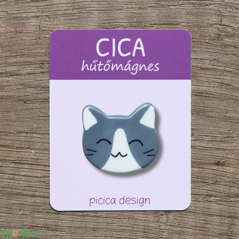 Cica hűtőmágnes - Szürke tuxedo Vidám