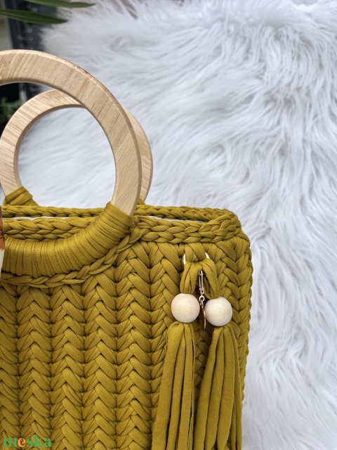 Mustársárga horgolt táska fa fogantyúval és selyemsállal - MAANED design