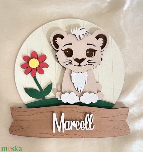 Oroszlán kerek névtábla gyerekszobába, ajtóra fából, gyerekszoba dekoráció, babaváró buliba ajándékötlet