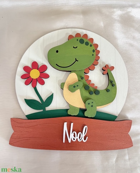 Dínó kerek névtábla gyerekszobába, ajtóra fából, gyerekszoba dekoráció, babaváró buliba ajándékötlet