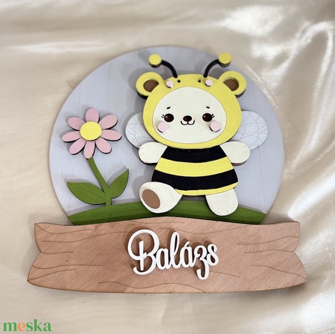 Méhecske kerek névtábla gyerekszobába, ajtóra fából, gyerekszoba dekoráció, babaváró buliba ajándékötlet