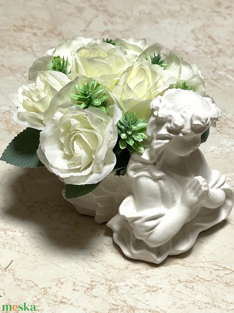 Hófehér angyalkás kicsi sírdísz selyem rózsákkal díszítve