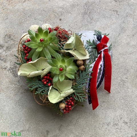 Szívalakú dekorbeton tálkába készült, 2 kövirózsás, pöttyös szalagos, pirosas fűszerezésű, egyedi kegyeleti dísz