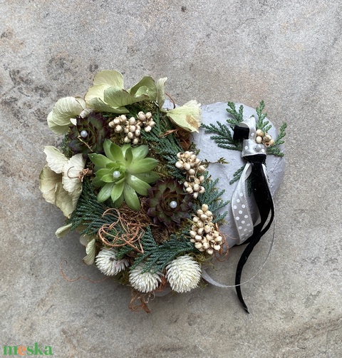 Szívalakú dekorbeton tálkába készült, 3 kövirózsás, pöttyös szalagos, fehéres fűszerezésű, egyedi kegyeleti dísz