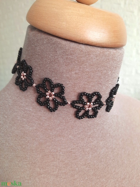 Gyöngyös nagy virágos, fekete, rövid állású nyaklánc