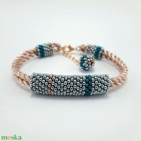 üveggyöngy, gyöngyfűző cérna, sodort zsinór, fém szerelék