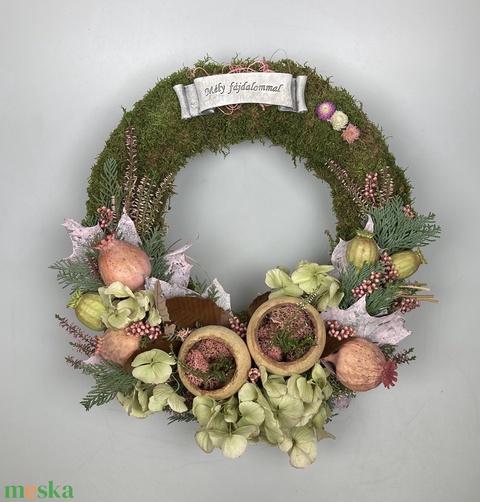 - Anyaga: kellékek, termés, szárazvirág, mohakoszorú