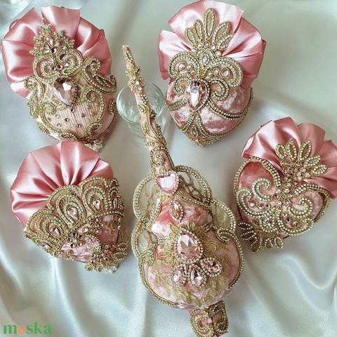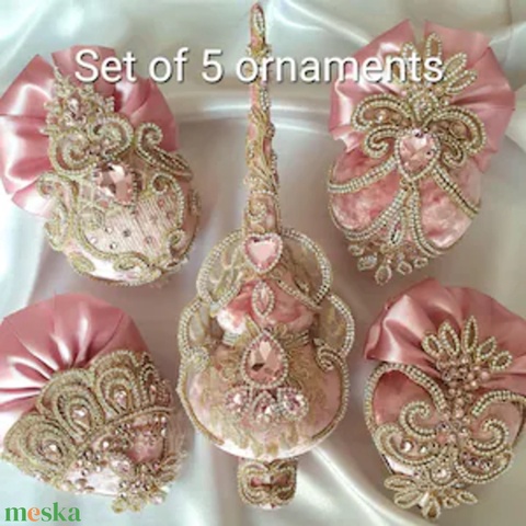 Rózsaszín karácsonyi szett – 4 kézzel készült díszgömb és 1 csúcsdísz, bársony, strasszos, elegáns Xmas dekoráció