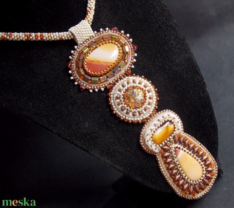 - Anyaga: japán kása, delica, preciosa bicon, swarovki rivoli, mokkaite jasper, crescent bead, tila bead, gemduo, francia drot